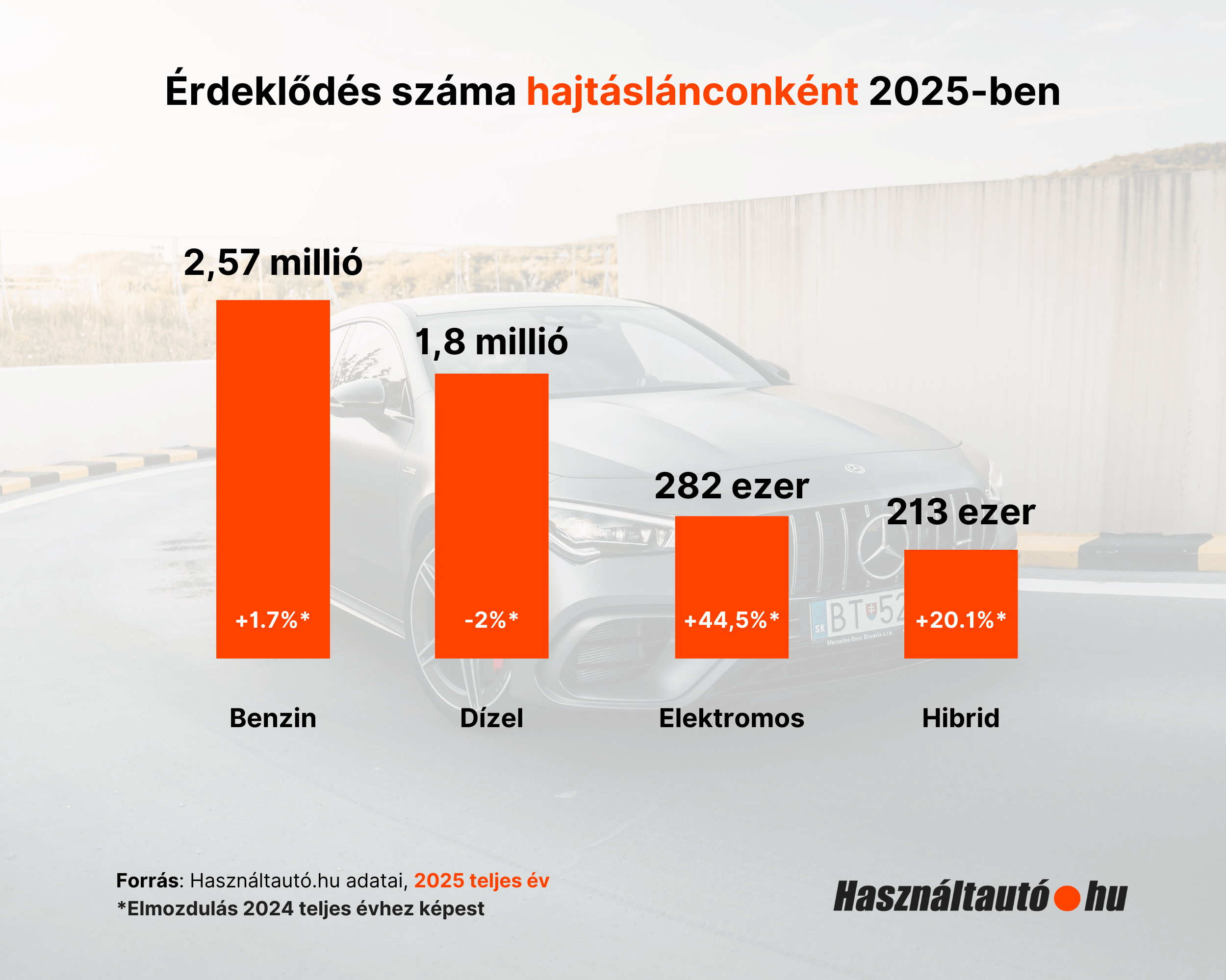 2025-ben kedvező számokat mutatott a hazai használtautó-piac: a Használtautó.hu adatai szerint a teljes éves érdeklődések száma több mint 130 ezerrel, közel 3%-kal nőtt az előző évhez képest, miközben a kínálat volumene stabil maradt.