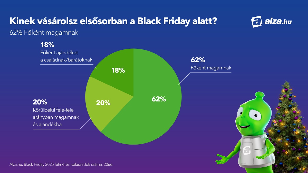 1160 válaszadóból 715-en, azaz 62% választotta azt, hogy főként magának vásárol a december 1 éjfélig tartó Black Friday alatt. 236-an azt jelölték meg válaszul, hogy fele-fele arányban vásárolnak másoknak és maguknak.