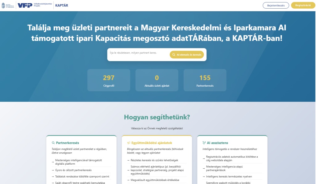 A Magyar Kereskedelmi és Iparkamara által megszervezett Országos Kamarai Beszállítói Program tapasztalatai alapján új, országos fejlesztésű, mesterséges intelligencia alapú online platform indul KAPacitás megosztó adatTÁR, azaz KAPTÁR néven. Ennek célja, hogy segítse a vállalkozásokat az üzleti partnerek és szabad kapacitások gyors, célzott megtalálásában.