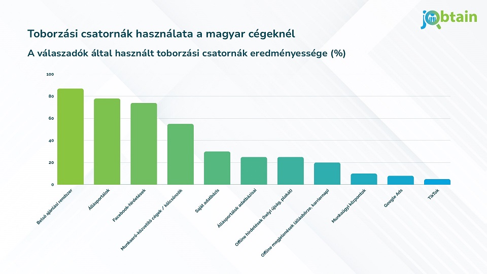 A megbízható munkaerő megtalálása mellett a kapcsolatok minősége is döntő fontosságú. A belső ajánlási rendszerek a leghatékonyabb toborzási csatornák (87%), ami azt mutatja, hogy a személyes kapcsolatok, a munkatársi bizalom és az ajánlások szerepe kulcsszerepet játszik a sikeres kiválasztásban.