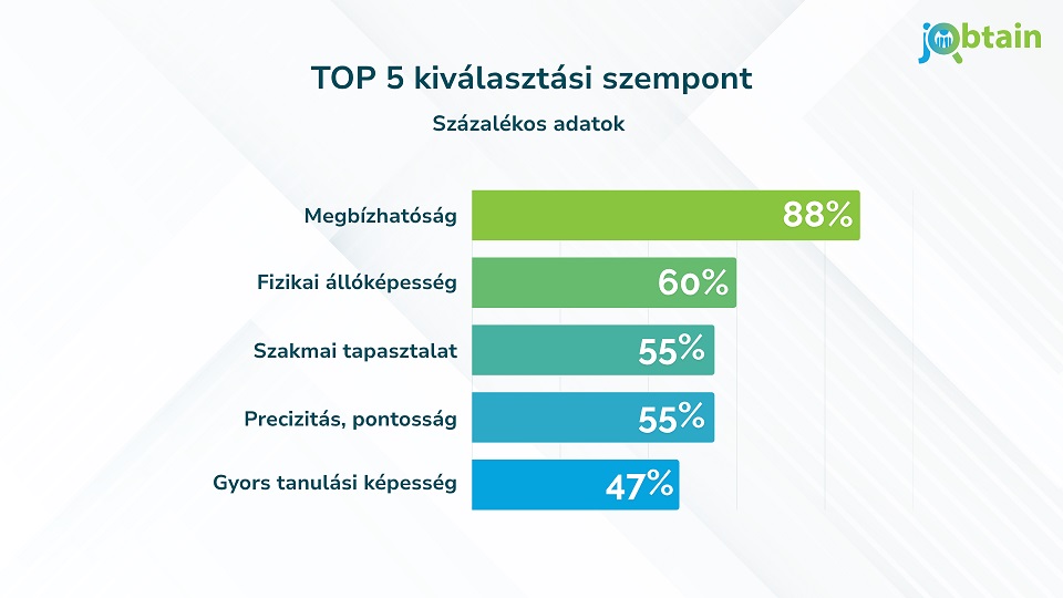 A válaszadók 88%-a a megbízhatóságot nevezte meg a legfontosabb kiválasztási szempontként, megelőzve a fizikai állóképességet (60%) és a szakmai tapasztalatot (54%).