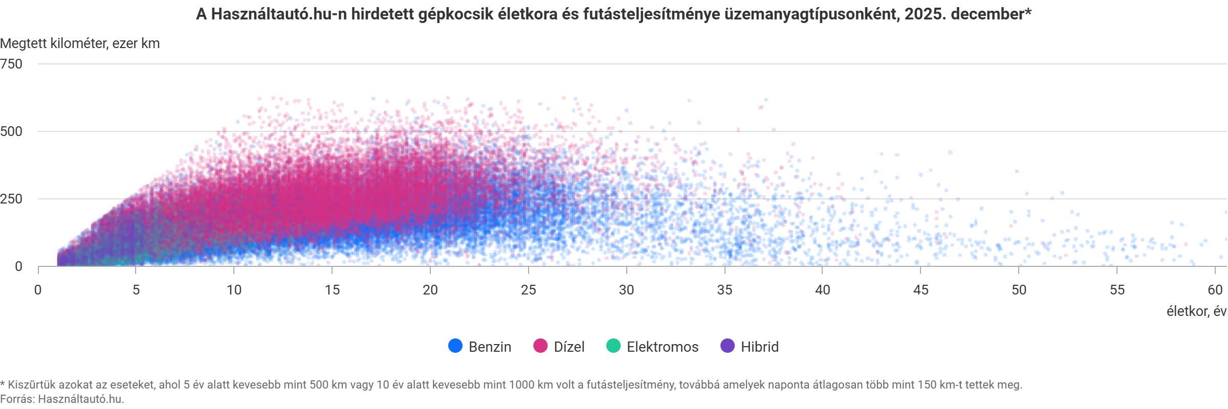 A futásteljesítmény és az életkor közötti összefüggés decemberben is jól kirajzolódott. A meghirdetett benzines autók átlagosan 154 ezer kilométert, míg a dízelek mintegy 220 ezer kilométert futottak, vagyis a dízelmeghajtású járművek közel 43%-kal nagyobb futásteljesítménnyel szerepeltek a kínálatban. A benzines autók átlagéletkora 13,5 év, a dízeleké 12,2 év volt. Éves összevetésben a dízelek futásteljesítménye stagnált, míg a benzineseké enyhén csökkent. A dízeles személygépjárművek átlagéletkorában egy év alatt 0,8%-os emelkedés, míg a benzinesek esetén 2,9 %-os csökkenés volt megfigyelhető.