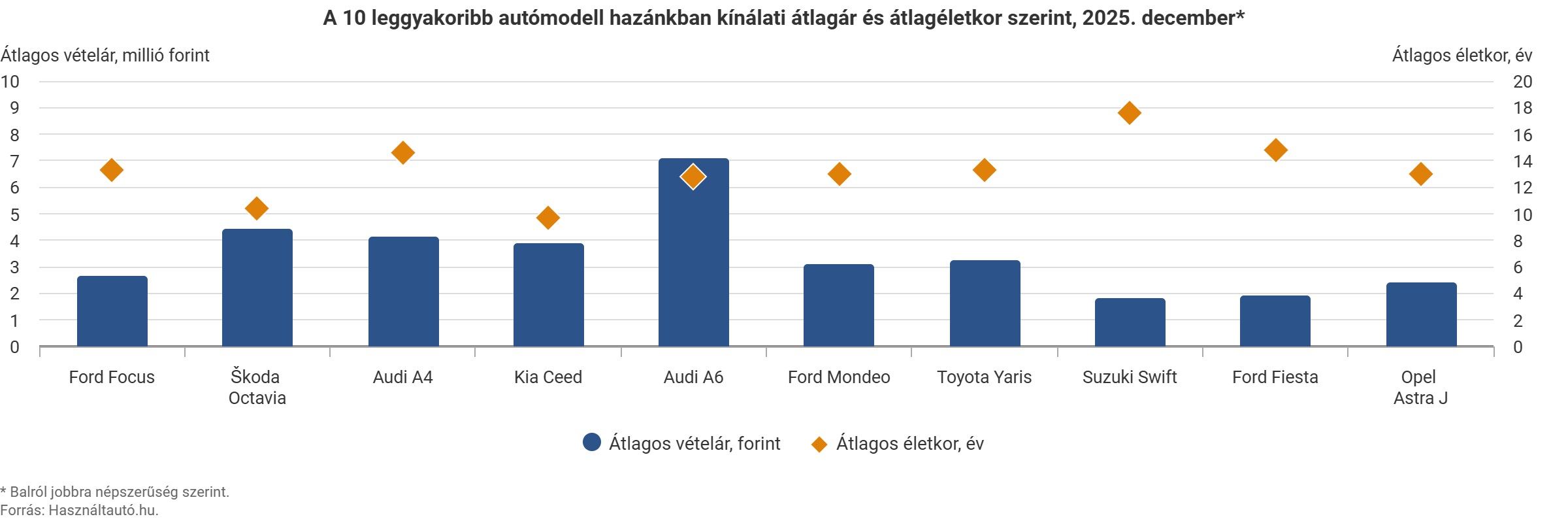 2025 decemberében a hazai használtautó-piacon megjelent hirdetések 37,2%-a 2,5 millió forint alatti, 28,3%-a 2,5–5 millió forint közötti, 22,5%-a 5–10 millió forintos, míg 12,0%-a 10 millió forint feletti árkategóriába tartozott. Egy év alatt a legolcsóbb szegmens aránya 4,3%-kal csökkent, miközben a 2,5–5 millió forint közötti, valamint az 5–10 millió forintos kategória súlya 1,7% és 2,5%-kal növekedett. A kínálati átlagár decemberben 5,5 millió forint volt, ami enyhe, nagyjából 100 ezer forintos emelkedést jelent az előző év azonos időszakához képest.