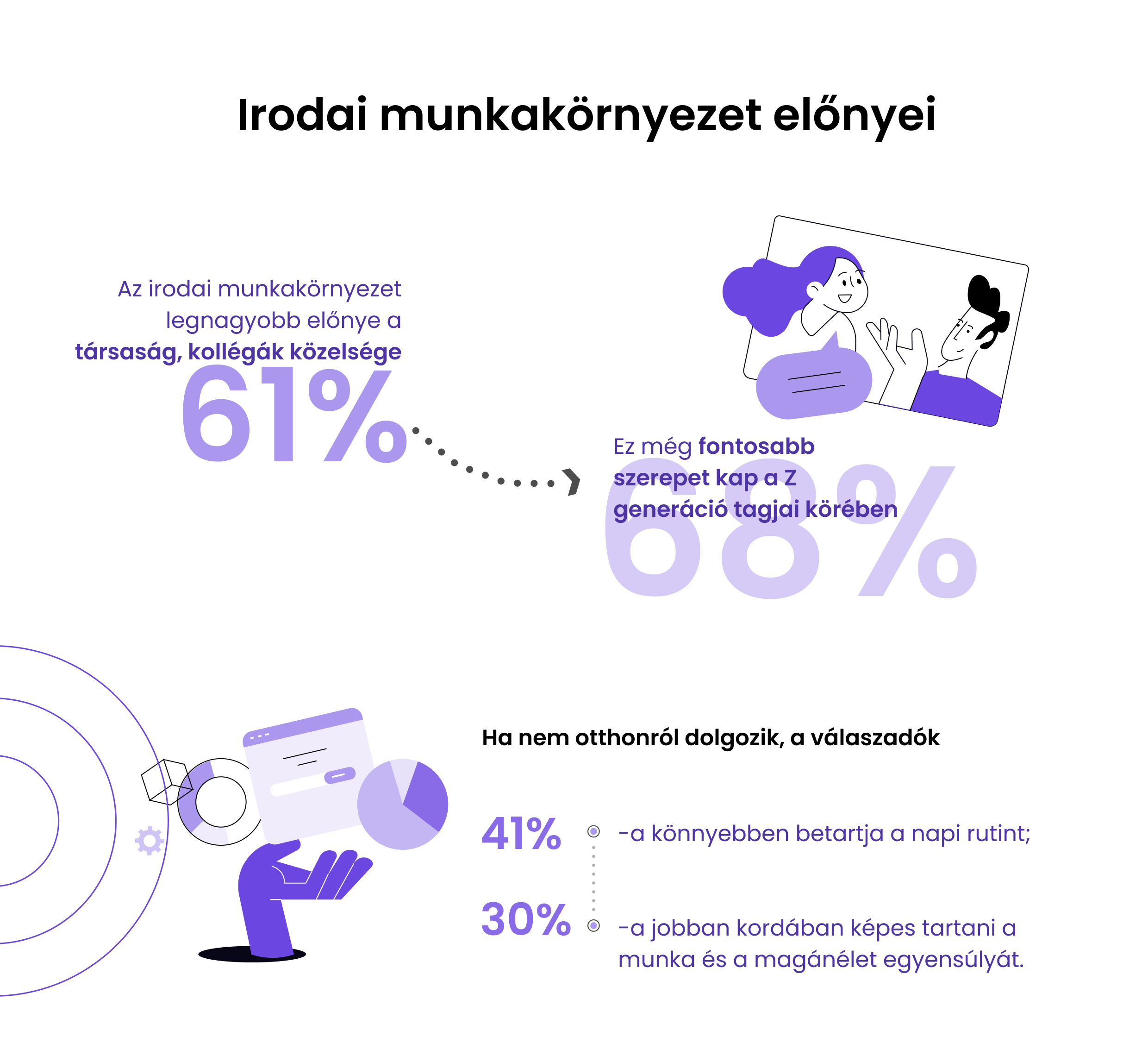 A hatékonyságon kívül fontos szempont az is, hogy miért szeretnek bejárni az irodába a dolgozók, illetve miben látják az irodai munka előnyeit. Összhangban a korábban írtakkal, a legfontosabb érvnek az irodai munkavégzés mellett a kollégák jelenléte bizonyult (61%). Ez a komponens a vezető beosztásúak és a Z-generáció tagjai körében volt a legmagasabbra értékelt. Az irodai munkavégzés kiemelt előnyeinek listáján a következő pont a napi rutin könnyebb betarthatósága (41% értékeli ezt az előnyt), valamint az irodai napok mellett szóló toplistás tényező még a munka–magánélet egyensúly könnyebb fenntarthatósága is (30% emelte ki ezt az érvet).