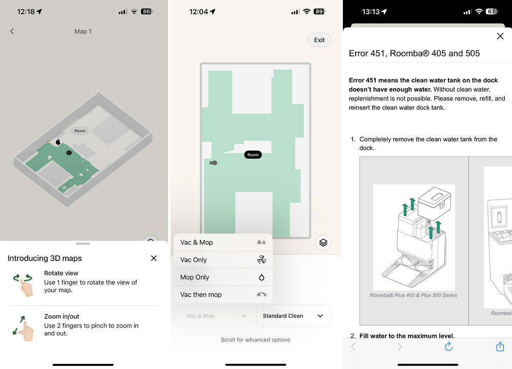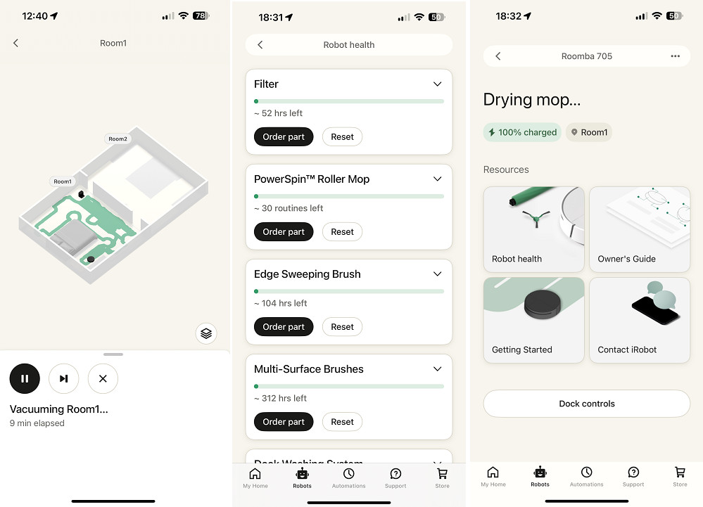 A vezérlés és az applikáció külön dicséretet érdemel. Az iRobot Home app nemcsak részletes statisztikákat mutat, hanem valós időben is nyomon követhetjük, merre jár a gép, mely területeket takarította már fel, és melyek vannak még hátra. Beállíthatunk zónákat, takarítási rutinokat, sőt, akár azt is, hogy bizonyos területeket kerüljön el a robot (pl. a cica alvóhelyét). A térképek szerkeszthetőséges és használata gyerekjáték, az applikáció stabil, ami manapság sajnos nem egyértelmű minden okoseszköznél.