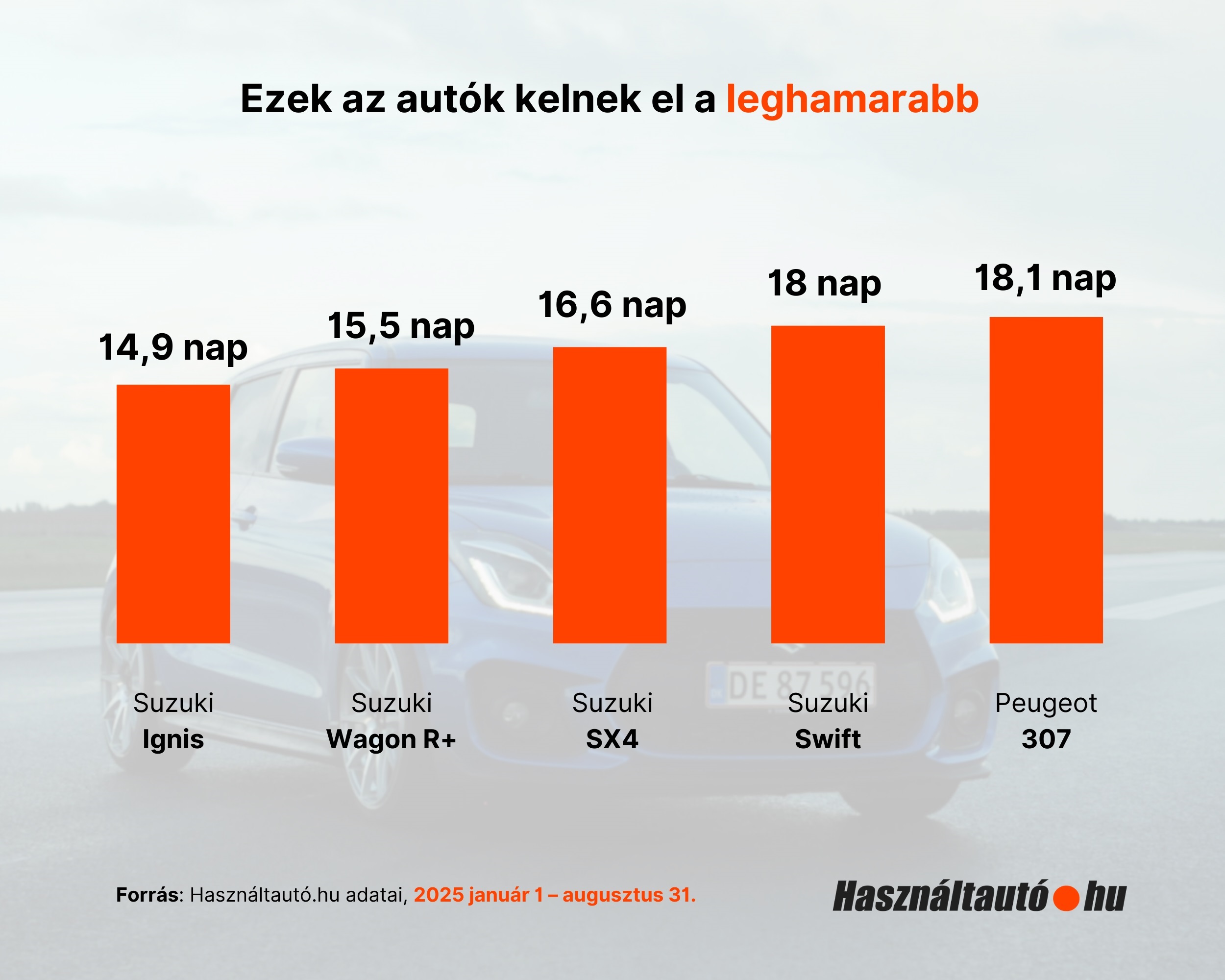 A Használtautó.hu friss, 2025 január–augusztusi adatai alapján egyértelmű, hogy a magyar használtautó-piacon egyes modellek szó szerint napok alatt gazdára találnak. A leggyorsabban eladható típusok listáját a Suzuki vezeti: az Ignis mindössze 14,9 napos átlagos eladási idővel áll az első helyen, szorosan mögötte a Wagon R+  – 15,5 nap,  és az SX – 16,6 nap. A negyedik helyen a Suzuki Swift található 18 napos átlagos turnover-idővel, míg az ötödik leggyorsabban eladható modell a Peugeot 307, 18,1 napos értékkel.
